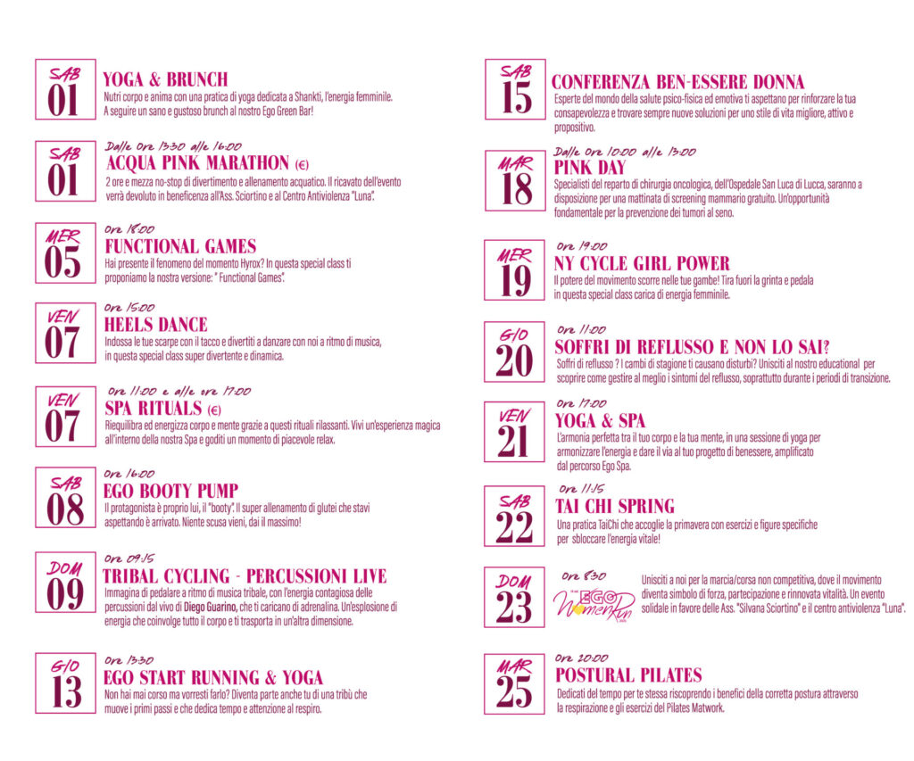 Per questo motivo, siamo felici di presentarti EGO MARZO DONNA 2025, un esclusivo PROGRAMMA DI ATTIVAZIONE WELLNESS di 31 giorni, tutto a soli 169€!